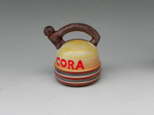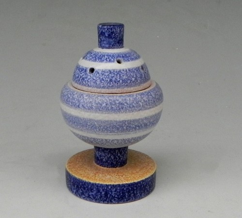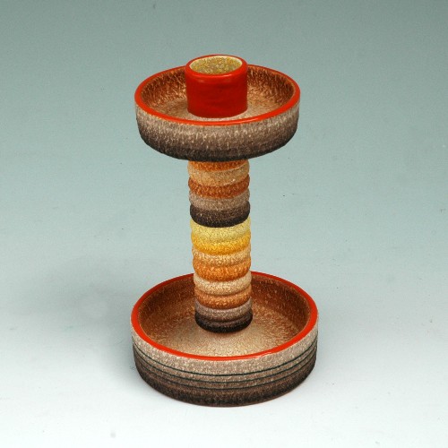 La seconda, successiva, di qualche anno, è terracotta maiolicata matt con effetto a buccia d'arancia, decorata con motivi geometrici a colori vivaci e sfumature.