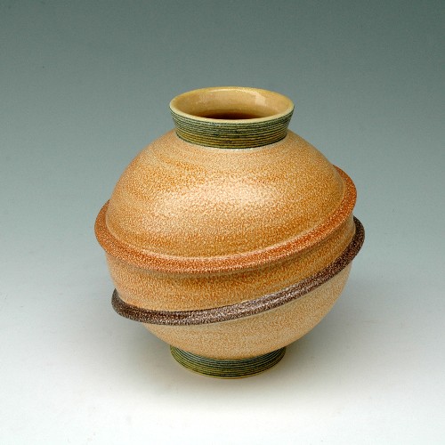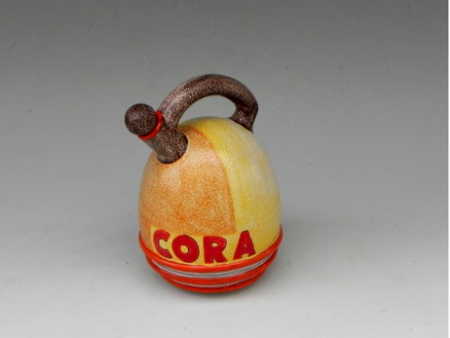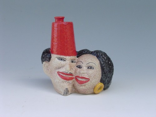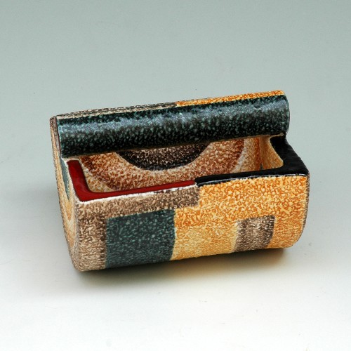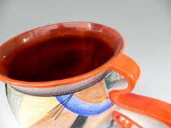 La seconda, successiva, di qualche anno, è terracotta maiolicata matt con effetto a buccia d'arancia, decorata con motivi geometrici a colori vivaci e sfumature.