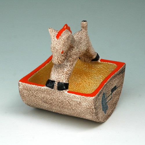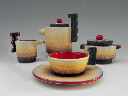 Si hanno, pertanto, due tipologie. La prima è terracotta con forme "sbilenche, insensate ed eccentriche", decorata con motivi geometrici a colori "urlanti" e ricoperta di cristallina traslucida.